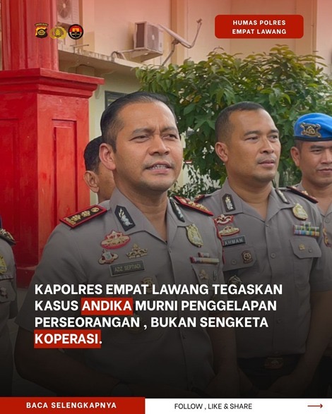 BERITA EMPAT LAWANG – Kapolres Empat Lawang AKBP Abdul Aziz Septiadi, S.H., S.I.K., M.H., menegaskan, perkara hukum yang menjerat Andika merupakan kasus penggelapan murni secara perorangan antara Andika dan pihak perusahaan, serta tidak berkaitan dengan koperasi, meskipun Andika diketahui menjabat sebagai ketua koperasi.