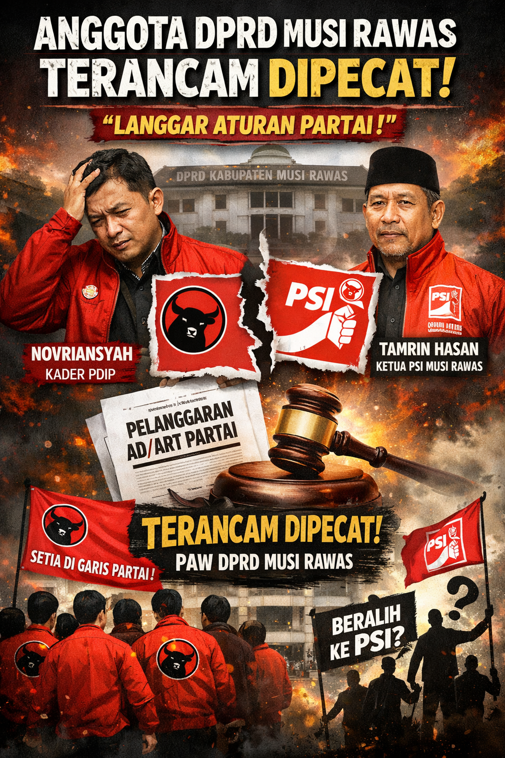 Disinyalir seorang anggota DPRD Musi Rawas dari Fraksi PDI Perjuangan, Novriansyah, terancam sanksi berat hingga pemecatan menyusul dugaan pelanggaran serius terhadap AD/ART, Peraturan Partai.